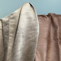 Shimmery, lustrous gold velvet pile with brown basecloth, and subtle soft pink with cream basecloth. Very drapey and super soft handle! DELISH!